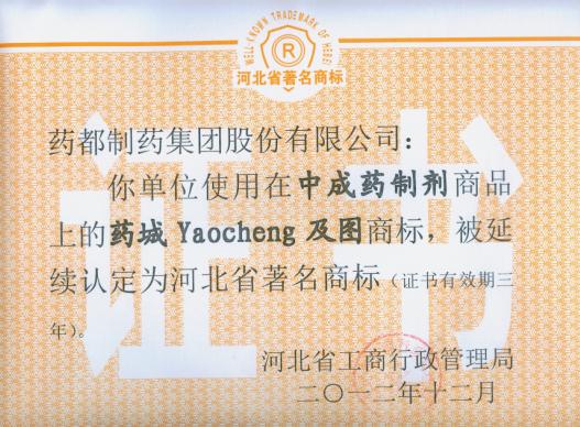 2012年12月,經(jīng)河北省工商行政管理局審評,我公司“普濟堂”商標(biāo)、“藥城”商標(biāo)被延續(xù)認(rèn)定為河北省著名商標(biāo)。