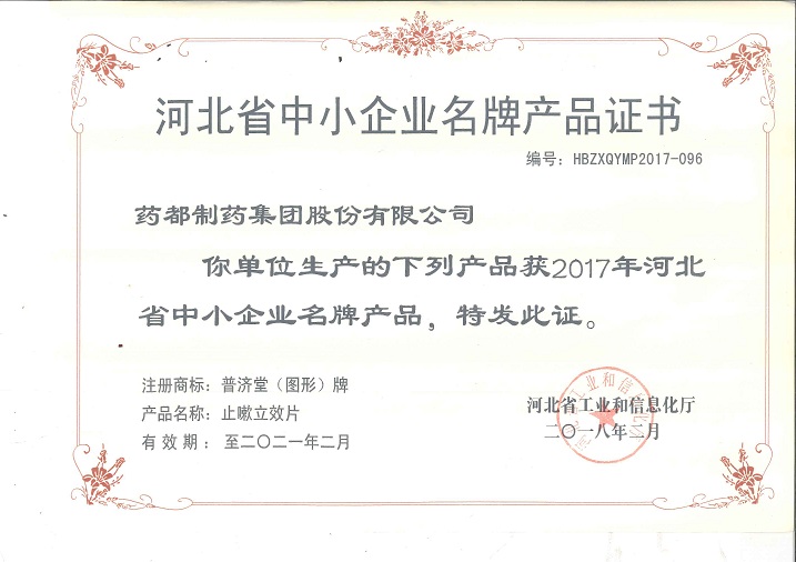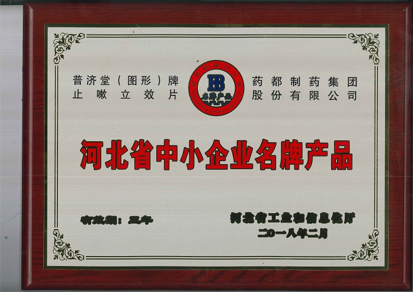 普濟堂牌止嗽立效片榮獲2017年河北省中小企業(yè)名牌產品